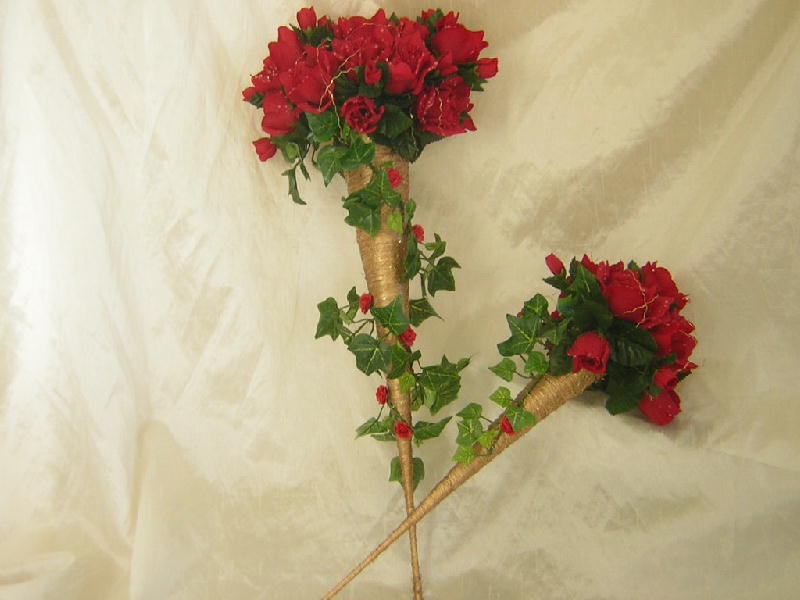 This beautiful brides unusual style bouquet set in a sisal fashionable cone in either gold or silver, twisted ivy around the cone with small roses and a mass of open and closed bud roses with sprays of tiny seven heaven flowers embedded with ivy and entwined with gold/silver fancy bullion wire.