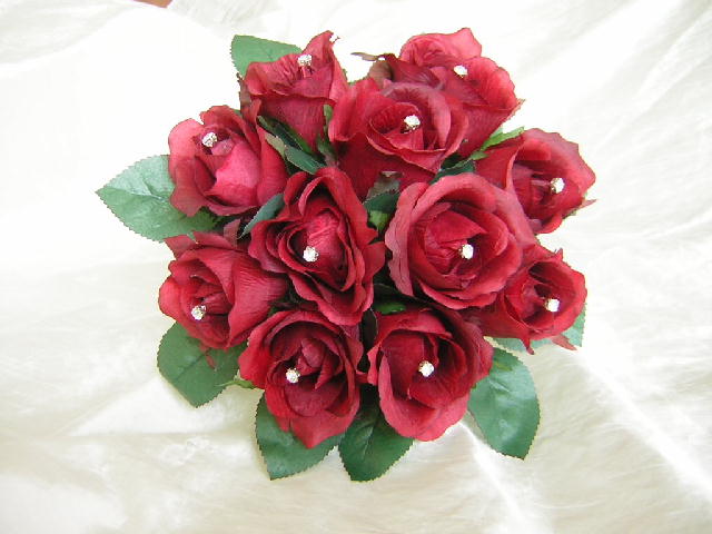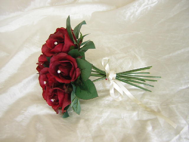 Bride’s modern style posy made from extra large bud roses. Each rose bud has a large diamante set in the centre of each rose, and to give it that ultra modern style I have left the stems long and exposed wrapped with a delicate ribbon in the colour of your choice.