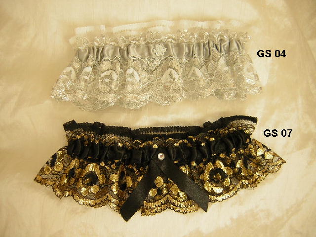 Hand crafted bride’s garters Sale was £4 now £1.50 each GS04 –White and Silver GS07 – Black and Gold Please quote reference number when ordering.